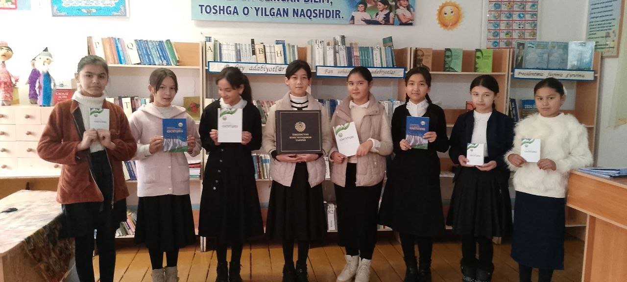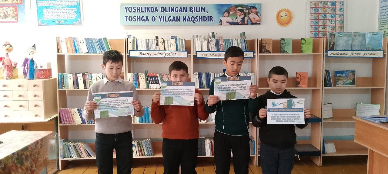 E'lon va tadbirlar 7-12-2024, 12:21 Xonqa tuman 32- son maktabda O'zbekiston Respublikasi Konstitutsiyasi qabul qilinganligining 32 yilligi munosabati bilan tadbir bo`lib o'tdi. Xonqa tuman 32- son maktabda O'zbekiston Respublikasi Konstitutsiyasi qabul qilinganligining 32 yilligi munosabati bilan tadbir bo`lib o'tdi.
